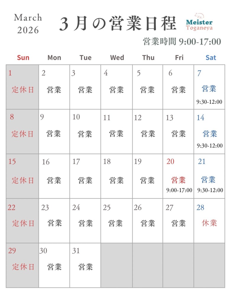 今月の営業日程 3月の営業日程をお知らせいたします。土曜日営業は3/28(土)意外は行う予定です。少しずつ暖かい日も増えてきましたね。お花見に行く際は、お酒のおともにレバーパテやテリーヌはいかがでしょうか?今月もたくさんの方のご来店、お待ちしております!